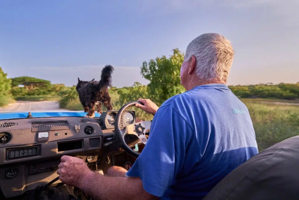 We went back happy and ready for a sundowner hosted by Andy, Caragh and Shan. Together with their 3 dogs, we all hopped into the old open Land Rover for a mini safari drive. About a kilometer from the resort and just near the airstrip, we met a herd of about 30 buffaloes at a temporary waterhole waiting for staffers to bring them water.