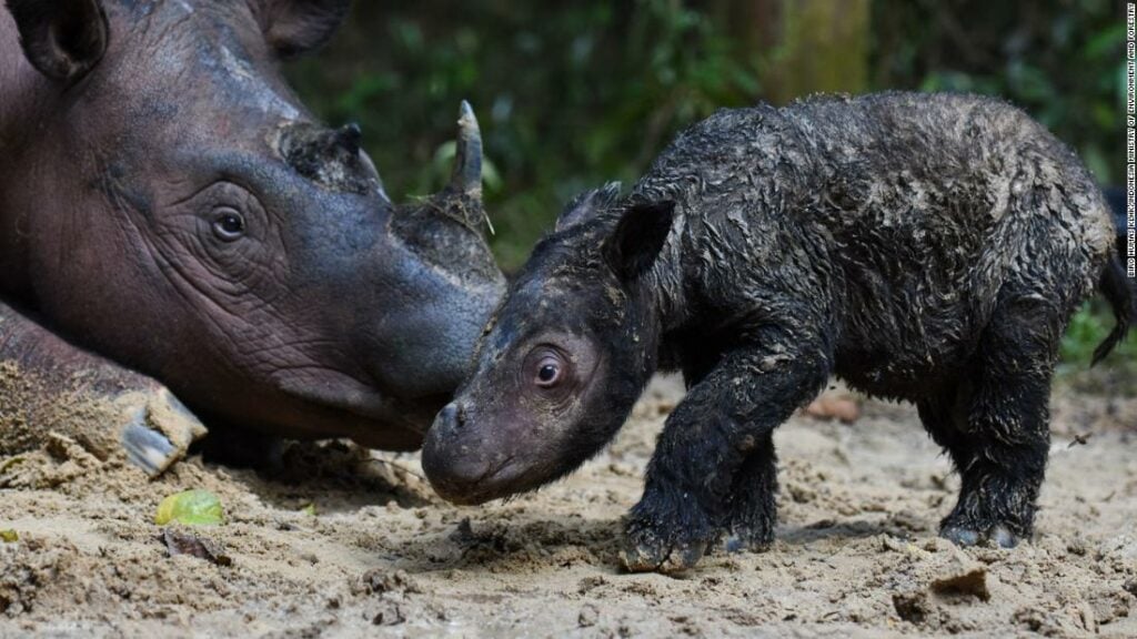 It’s also interesting to note that the Sumatran rhino is the smallest of the species and likely the closest living relative to the extinct woolly rhino. Calves are born with a dense covering that turns reddish-brown in young adults and becomes sparse, bristly and almost black in older rhinos.